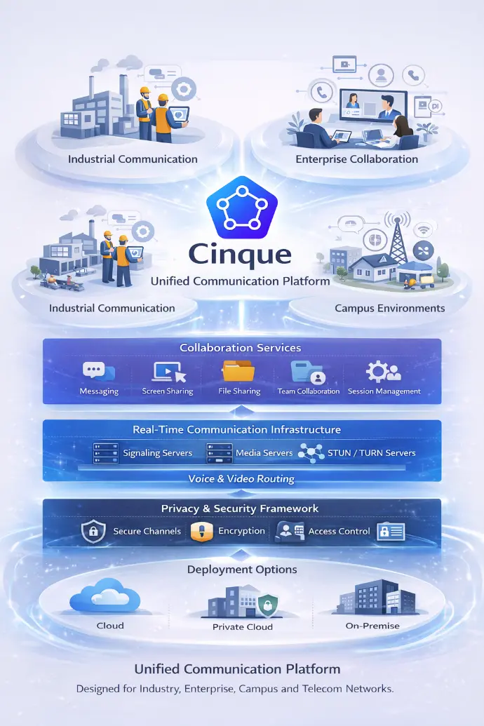 Cinque integrates voice, video and collaboration into a single secure platform designed for enterprise, industrial and telecom environments.