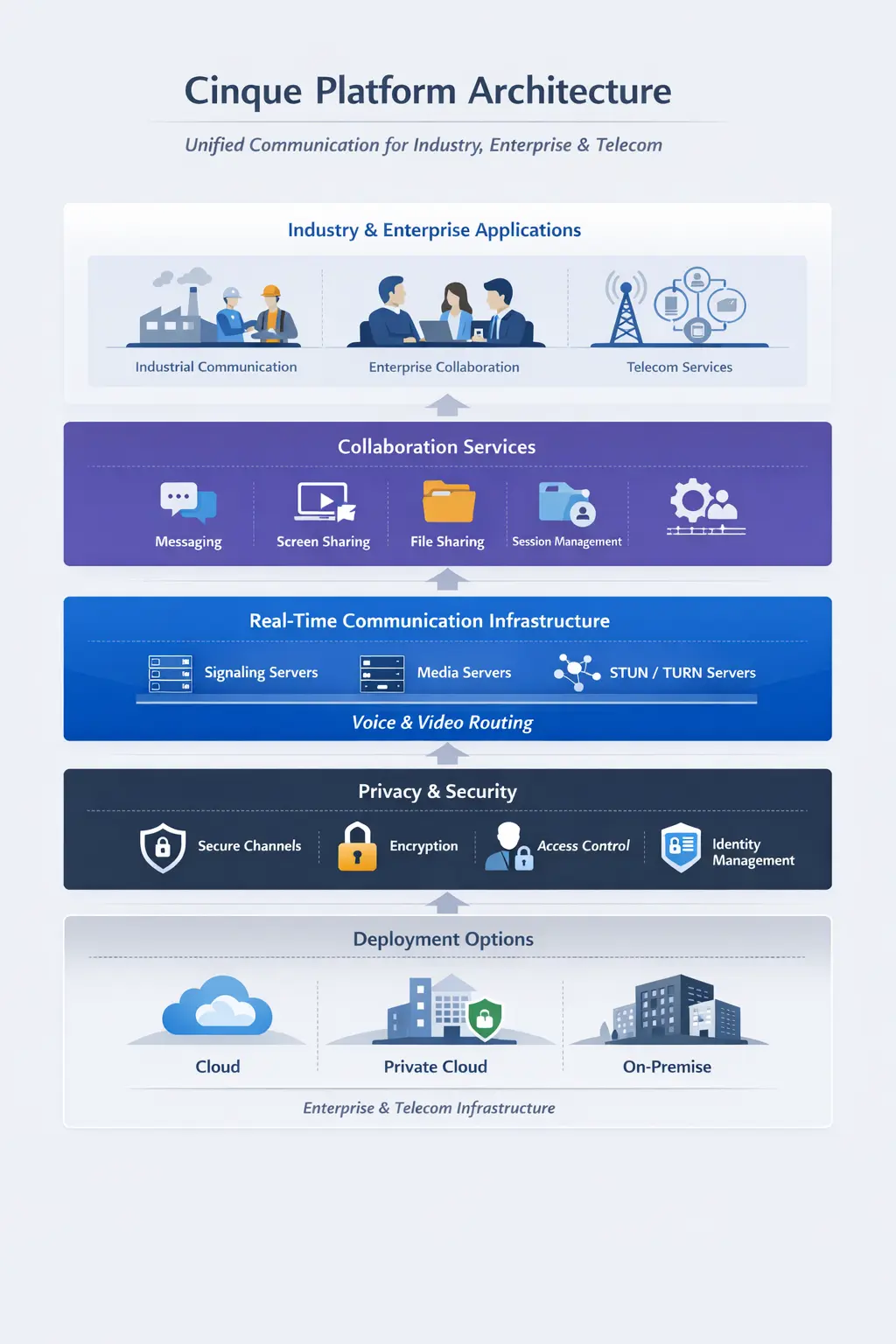 Cinque combines modular communication infrastructure, scalable collaboration services and flexible deployment models to enable reliable communication across organizations, industries and telecom environments.
